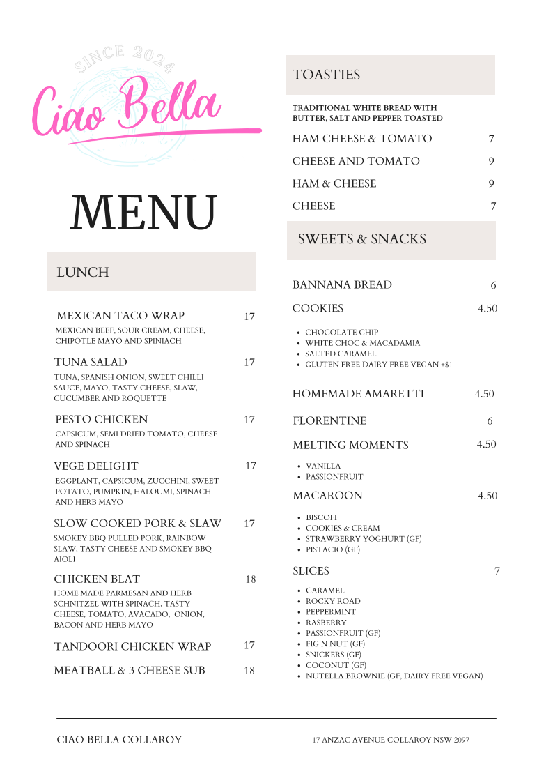 The positive reviews from customers underscore the café's great coffee, friendly atmosphere, and a menu that meets diverse dietary preferences. Whether you're enjoying a cozy brunch or on-the-go, Ciao Bella Collaroy is a true local gem.