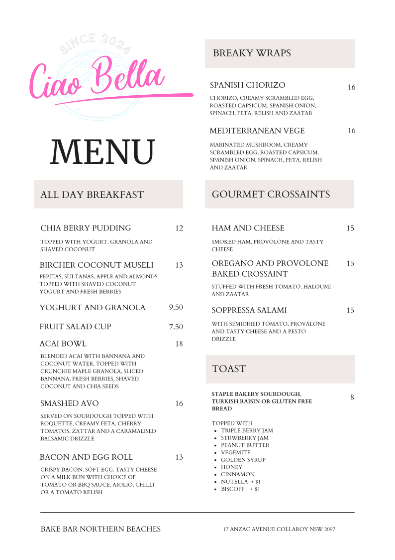 Welcome to Ciao Bella Collaroy, an inviting café nestled in the heart of Collaroy, NSW. This charming spot offers a delightful all-day breakfast menu that caters to various tastes. Highlighted dishes include the Chia Berry Pudding, a scrumptious blend topped with creamy yogurt and granola, and the indulgent Bircher Coconut Muesli, which showcases fresh fruits and a touch of coconut goodness.